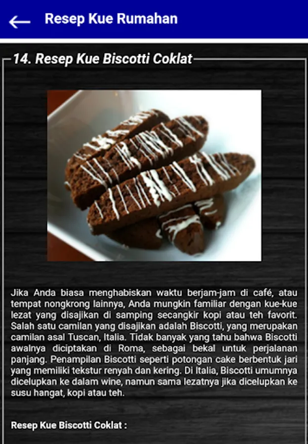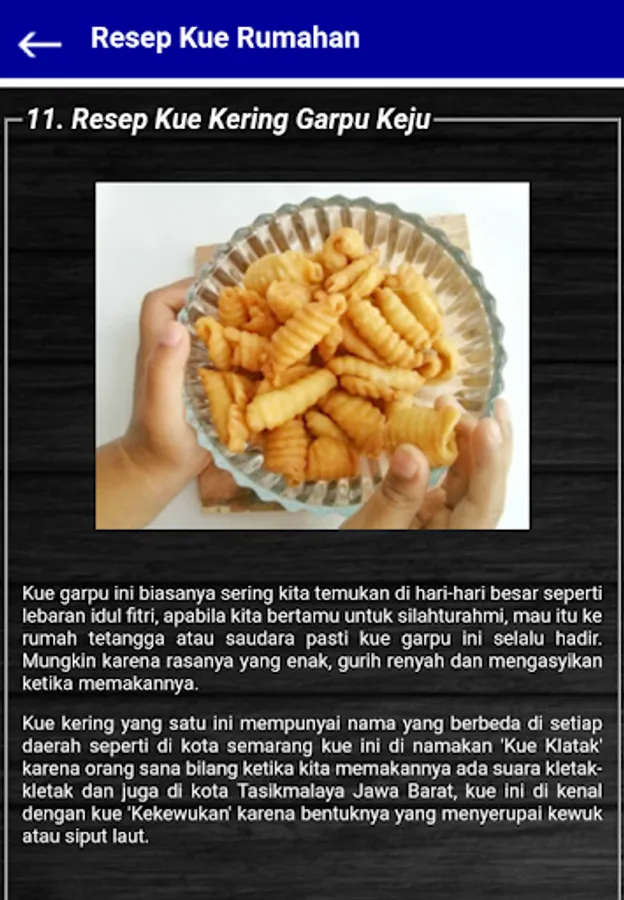 Contains a collection of various pastries, cakes and traditional cakes. Pastries are the term cake that is hard but crispy textured which has a very low moisture content because it is made in the oven. This application is to make it easier for mothers to look for references on recipe cakes to be made.