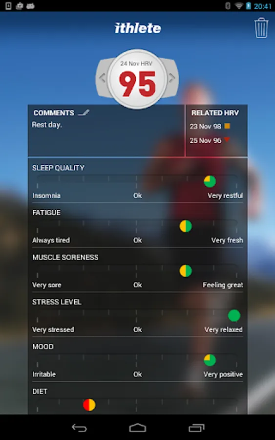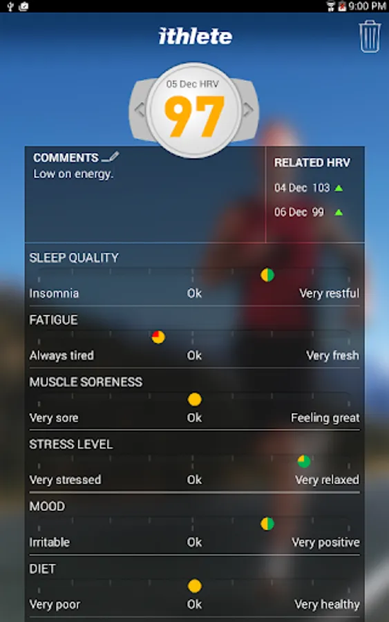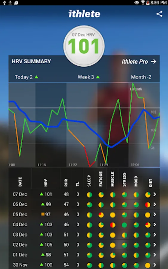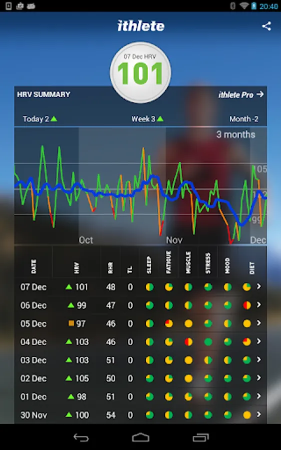 Simply take a 1-minute measurement every morning and follow the colour coded training recommendation: train as normal, train light or take a rest day. For more about heart rate variability see www.myithlete.com/what-is-hrv