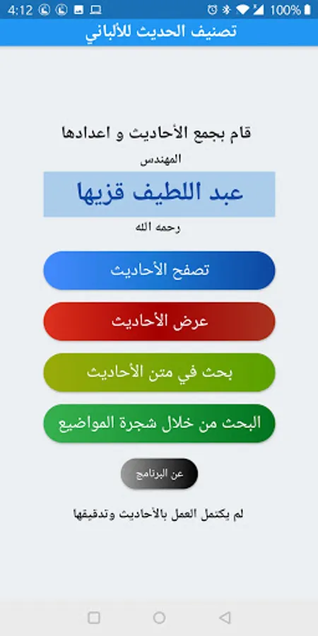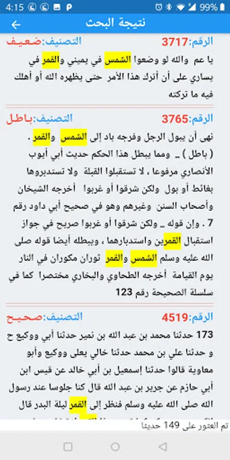 1 - Search for the Hadith by a word or several words after specifying the conditions that you wish If you do not specify conditions, the program will get you all the conversations of sixty volumes and shows you the degree of modern health and the number of talk and page number of the book that was extracted from the number and classification of jurisprudence.