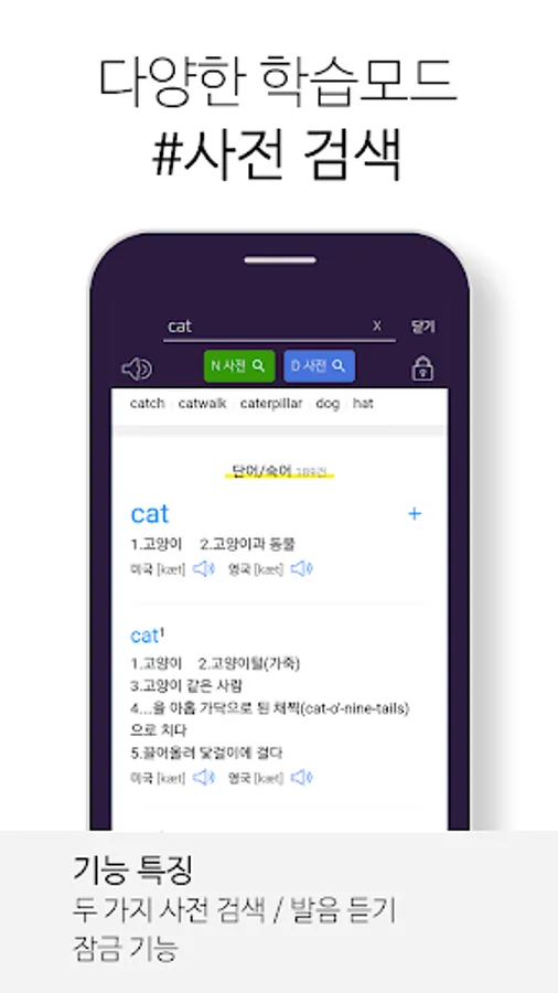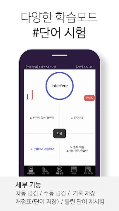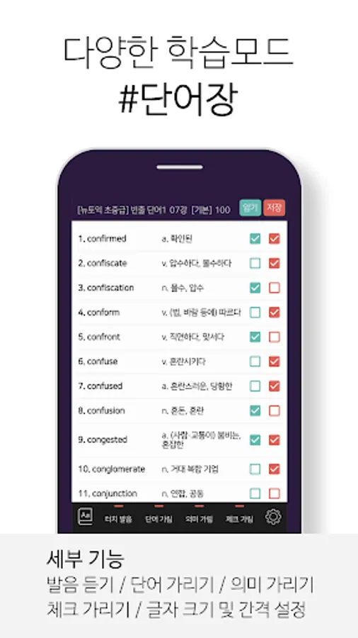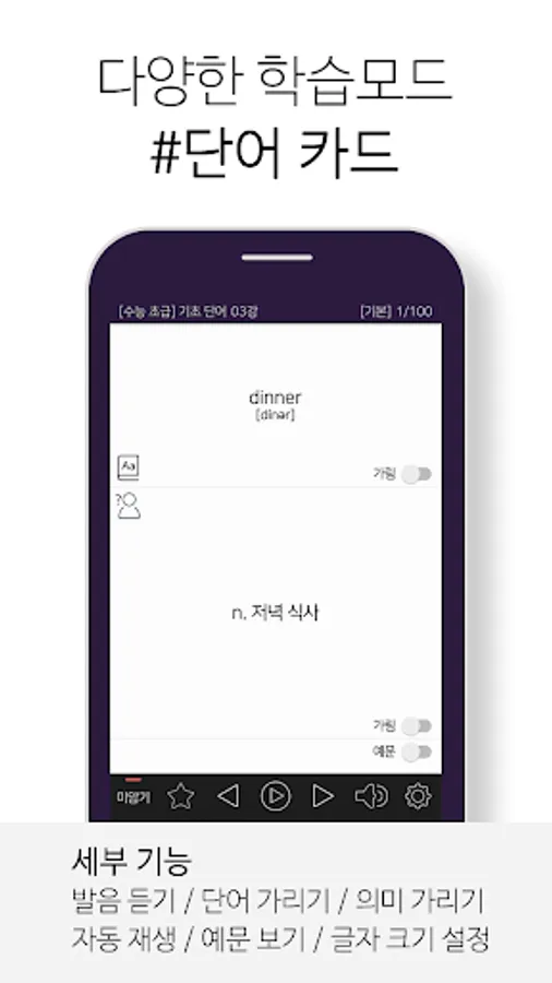 : Hide words / Hide meaning / Listen to pronunciation / View example sentences / Dictionary search / Auto play