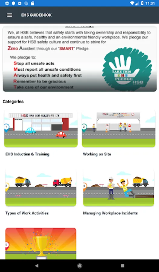 HSB EHS Guidebook Application is an educational and interactive app that has been customised to provide EHS knowledge and training for the employees of Hwa Seng Builder Pte Ltd