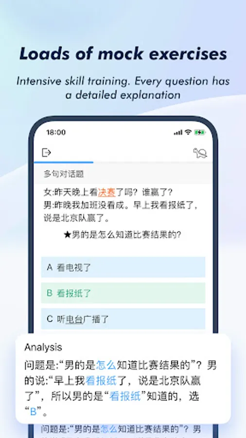To help you study for your HSK level exam, all the HSK practice material and HSK questions in the app have a detailed answer explanation. So whether you are preparing for HSK level 1 or HSK level 6, we’ve got you covered.