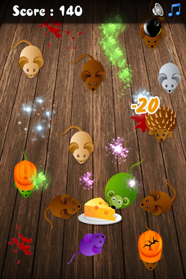 A large group of mice of unknown origin invaded your farm. Being a cheese farm owner, it's time to stand and defend your home. Now, only you can stop these greedy mice. Is your reaction fast enough? Fast tapping with your fingers, beating, grinding and repelling these mice. To destroy a cluster by wisely making the best use of your powerful tools, such as bomb, fire and lightning.