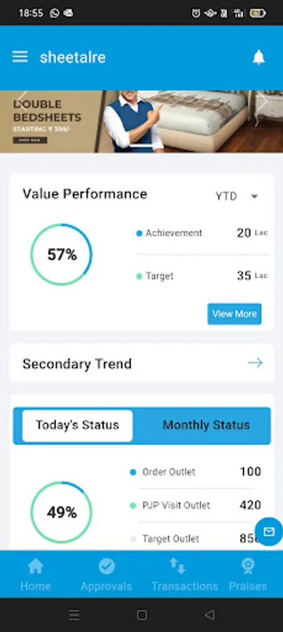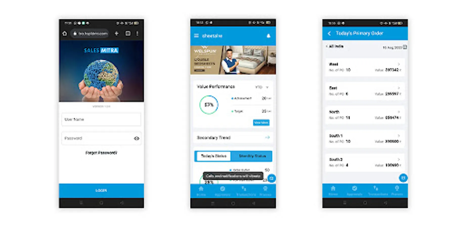 SalesMitra is an application which help sales team to check various parameters. This app helps to track value performance, secondary trend, productivity status, Active sales officers and their leaves, Todays Order received, Purchase Orders, MSS products and much more.