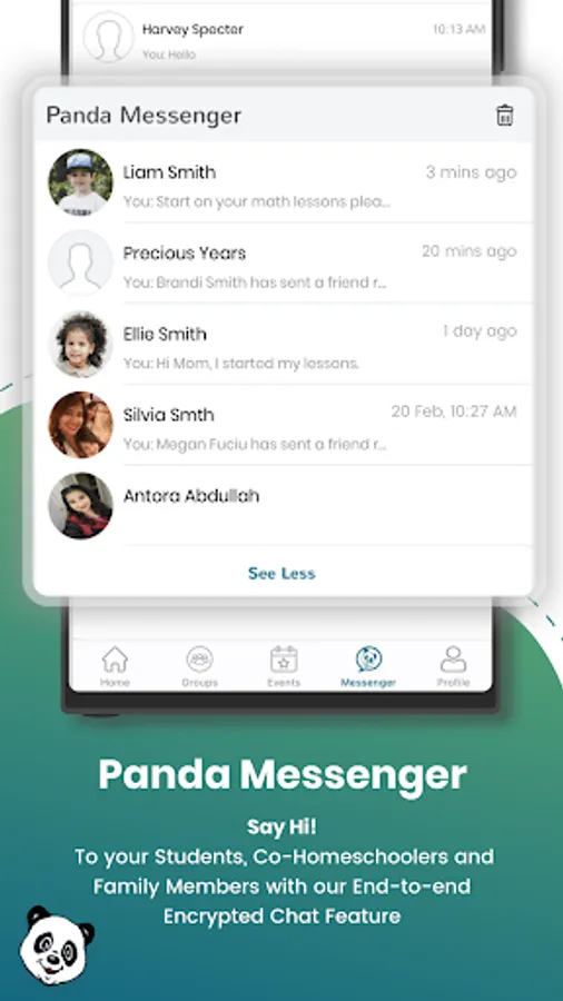 • Find and connect with other homeschoolers in your neighborhood and around the world using Panda Messenger
