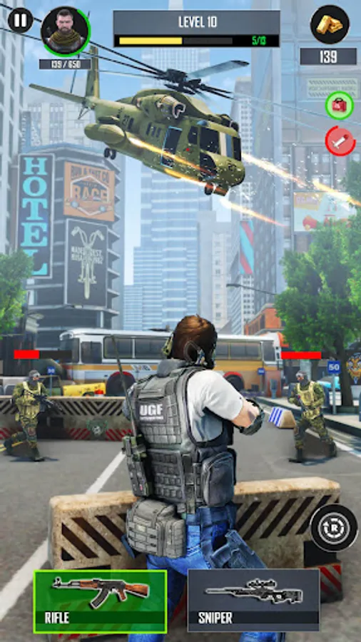 In combat shooting mission gun games, Each enemy will have a special ability to attack you most commonly they will use rifles to take you down in commando gun strike ops shooting gun games. Then there are grenades in the commando action ops shooting games which take time but are very lethal to take you down. As soon as you progress in the special ops forces shooting game you will get beaten by the enemies but do not worry you will have the option to revive yourself in commando action gun games with reviving kit. In the commando action strike ops game, After applying to revive kit you can again attack your enemies in anti-terrorist shooting gun games, kill them and complete the level. In fps gun shooting games offline after every 4 levels, you will face the boss in tps commando action offline games, As the word boss shows, he will be powerful and will not be beaten easily. Use the proper strategy in offline gun shooter games to beat them with commando gun strike ops.