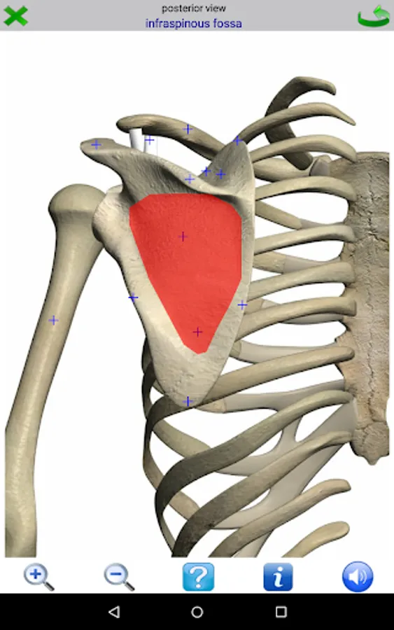 The user can zoom in to any area by using pinch zoom. The feature point (cross) can be selected by tapping on it. Detail button allows you to switch on/off the short description. For muscle section, detail button only show the description. Pressing the rotation button to allow you to change the view.
