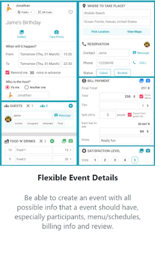+ Plan an event/party: date time, location, dishes menu, participants.