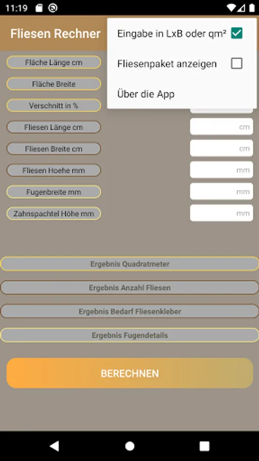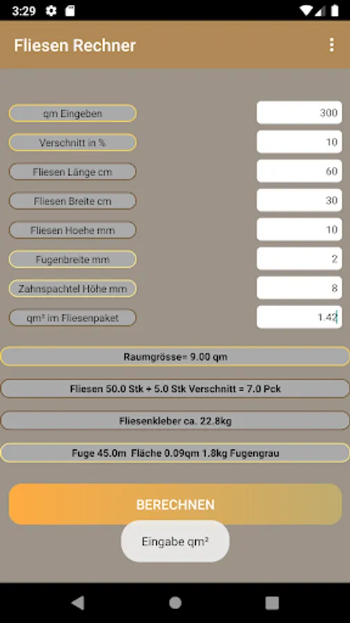 Simple calculator to determine quantities for tiles, glue and grout.