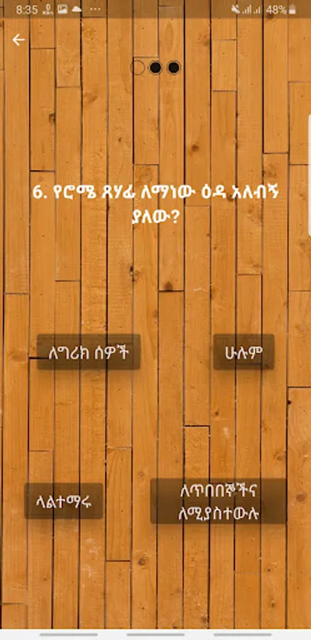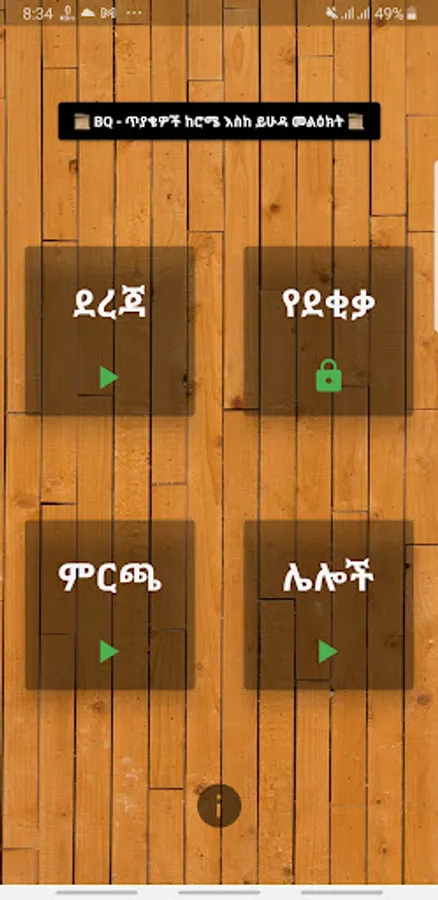Amharic Bible Quiz App for Ethiopian users Containing questions prepared in different levels based on the New Testament (Bible). This app will help its users to improve their bible knowledge and assist bible study, and also because it is prepared in Amharic language specifically for Ethiopian users it will be easily accessible.