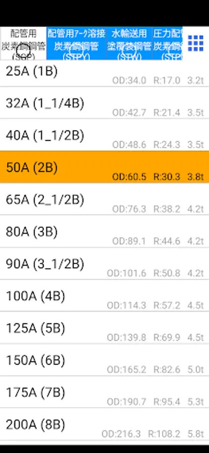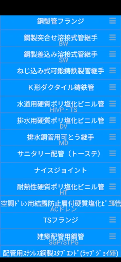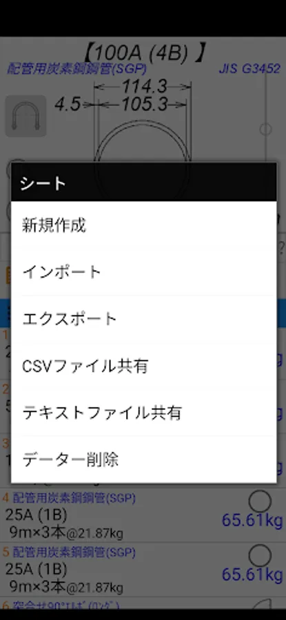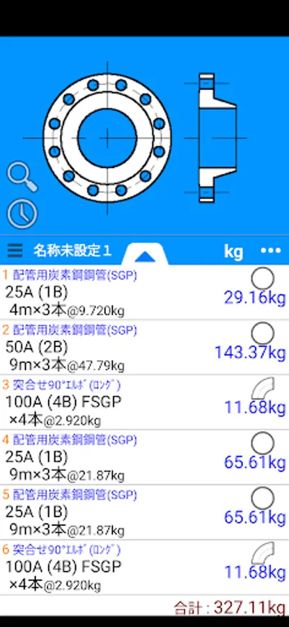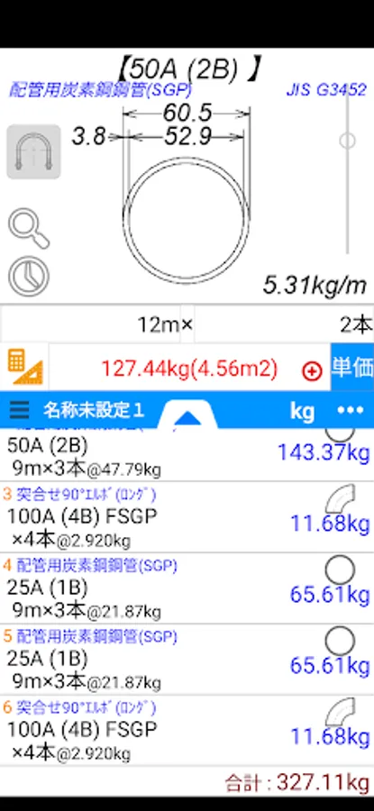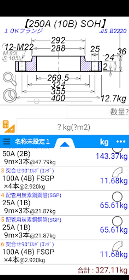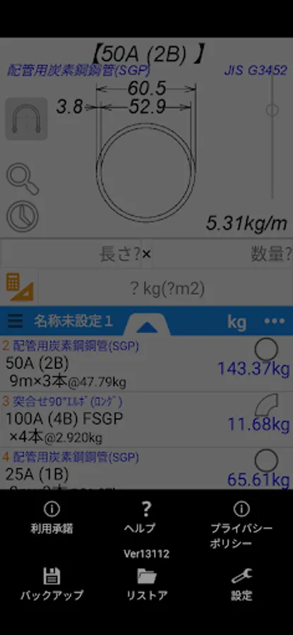 It is an application to calculate the dimensions and weight kg (surface area m2) of pipes (steel pipes), steel flanges, steel pipe joints, and PVC pipes. (In addition, the quantity is calculated back from the weight.)