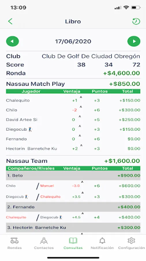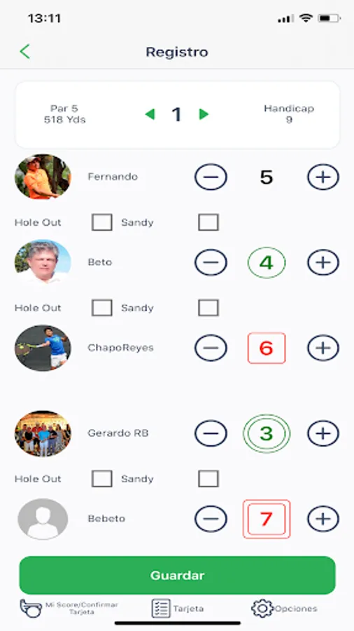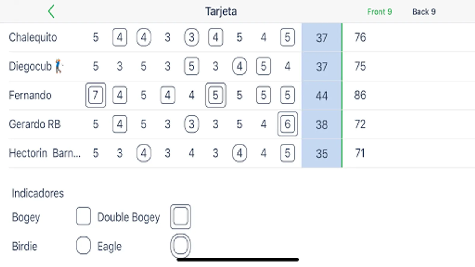 HandicApp GBB gives you all the information you need on each hole, the players record their score and other concepts achieved, during the round you can check your personal progress, that of your team and the accumulated statistics.