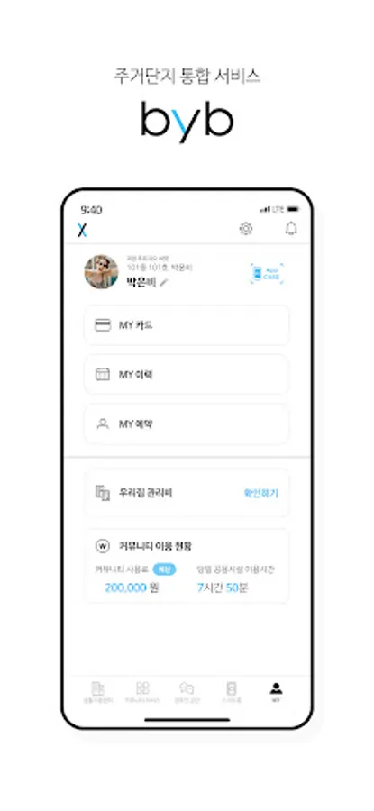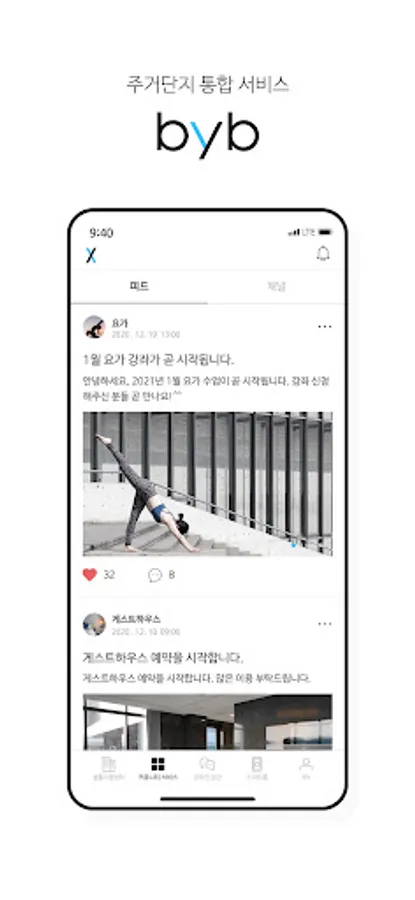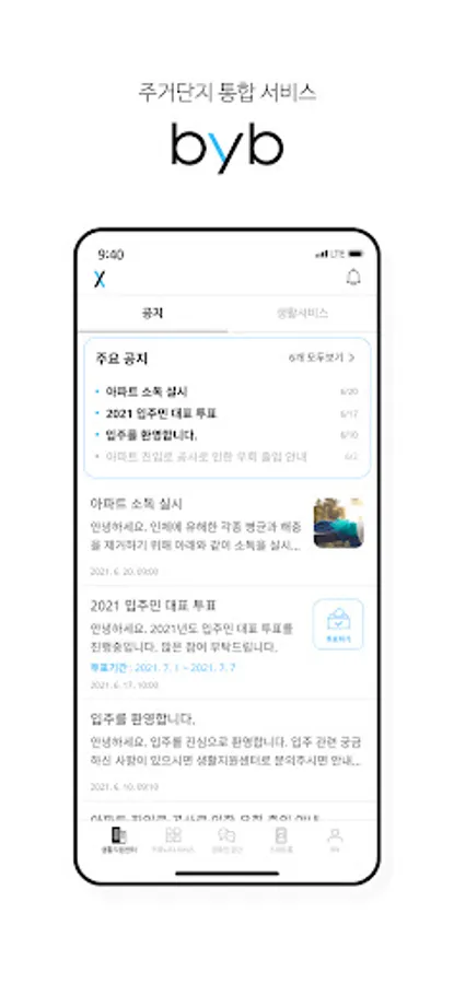 Byb is a ‘connected space service platform’ developed and operated by HTVyond, an IoT space technology company. Currently, we are changing the user's spatial experience centering on apartment complexes, and apartment complexes with well-developed community facilities such as Nine One Hannam and The H Honor Hills are mainly using ByB. Residents here make apartment access, elevator calls, reservations and payments for community facilities, check notices from the management office, votes and surveys, and communicate with neighboring residents through the ByB app. ByB is concentrating on the implementation of smart residential complexes beyond smart homes under the mission of ‘innovating spatial experiences with IoT technology’, and ultimately aims to become a smart city platform.