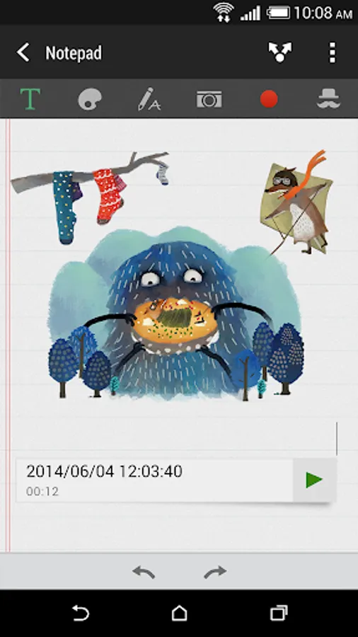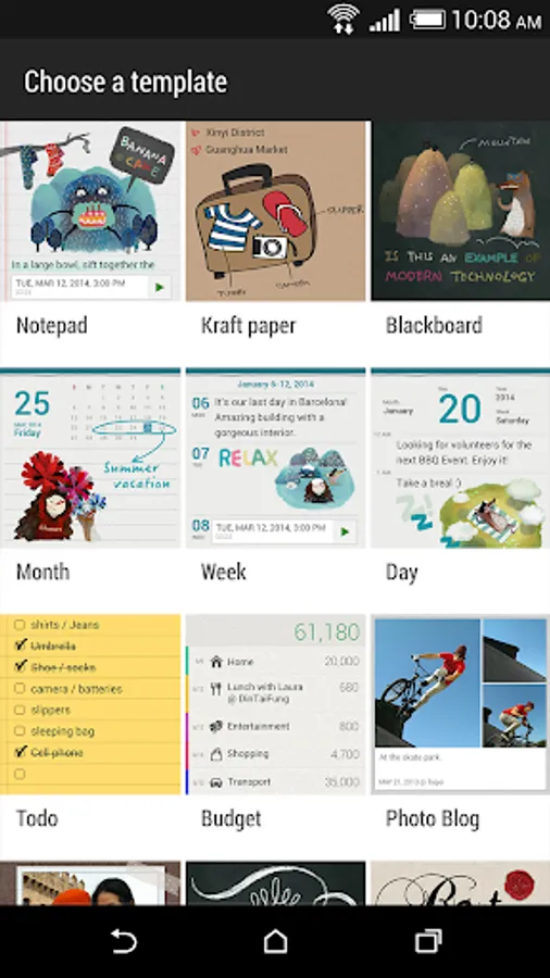 Want to make a page for your digital scrapbook or create interesting photos to share on your blog or social network? With ready-to-use templates in Scribble, you can get artistic and combine photos, text, and illustrations in a note. Your note can even display a bit of life when you include an animated gif. You can also add HTC Zoe photos.