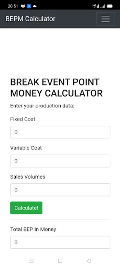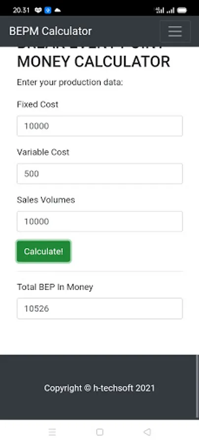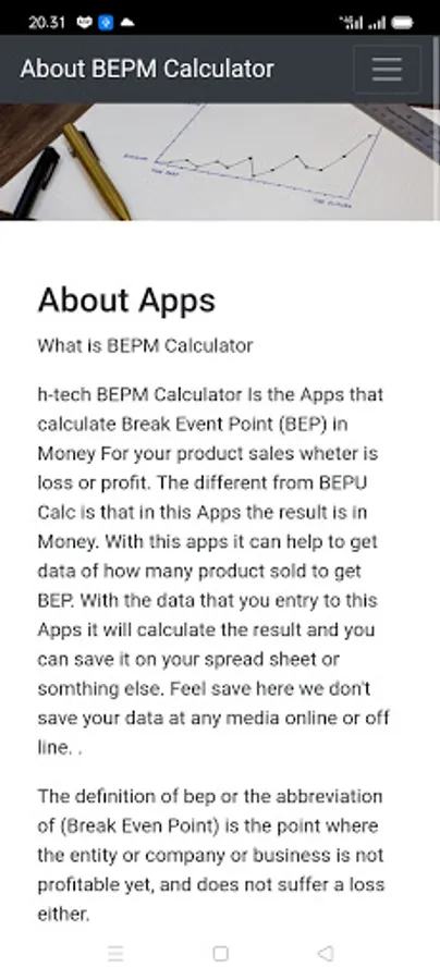 Htech BEPM Calculator Is the Apps that calculate Break Event Point (BEP) For your product sales. The different from BEPU Calculator is that in this Apps the result is in Money. With this apps it can help to get data of how many product sold to get BEP. With the data that you entry to this Apps it will calculate the result and you can save it on your spread sheet or something else. Feel save here we don't save your data at any media online or off line. .
