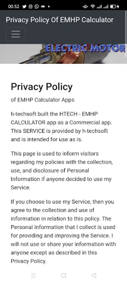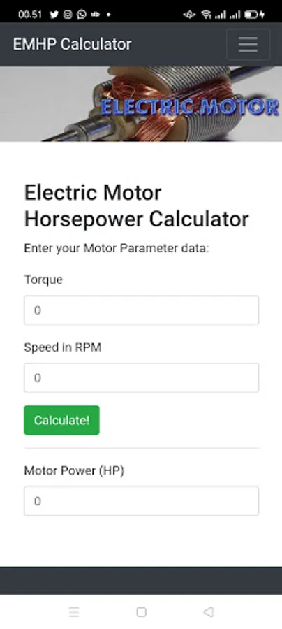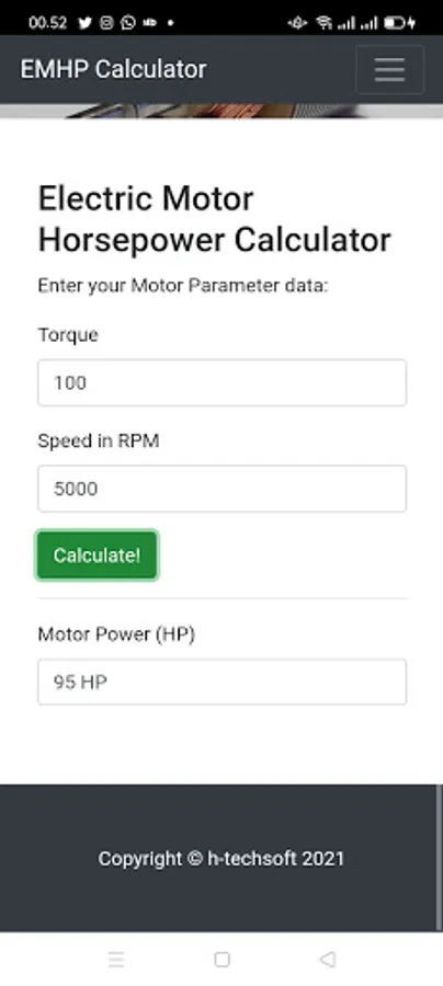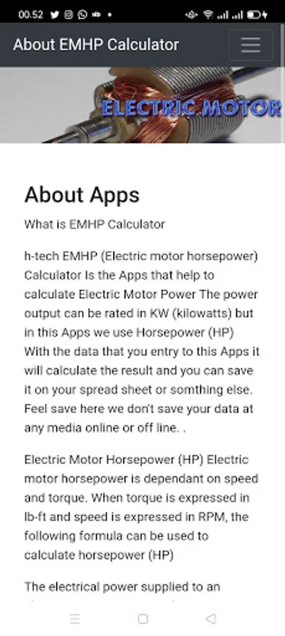 h-tech EMHP (Electric motor horsepower) Calculator Is the Apps that help to calculate Electric Motor Power The power output can be rated in KW (kilowatts) but in this Apps we use Horsepower (HP) With the data that you entry to this Apps it will calculate the result and you can save it on your spread sheet or some thing else. Feel save here we don't save your data at any media online or off line. .