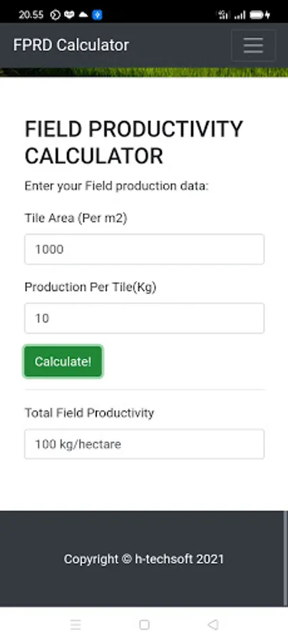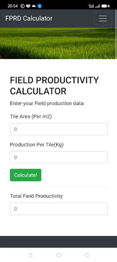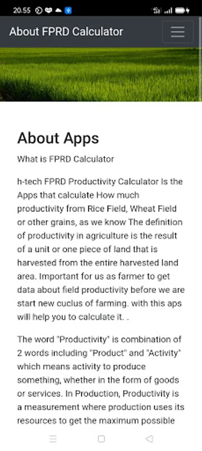 h-tech FPRD Productivity Calculator Is the Apps that calculate How much productivity from Rice Field, Wheat Field or other grains, as we know The definition of productivity in agriculture is the result of a unit or one piece of land that is harvested from the entire harvested land area. Important for us as farmer to get data about field productivity before we are start new cuclus of farming. with this aps will help you to calculate it. .