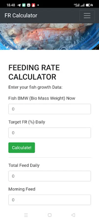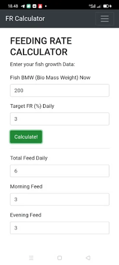 h-tech Feeding Rate Calculator Is the Apps that calculate How much food that we bring to the fish on pond exspecialy on Intensife farming like Biofloc, Through the data that we entry to this Apps wil calculate it. Just Enter The BMW (Bio Mass Weight) of your fish and how many in % Foods your gone give t the fish then the Aps Will automaticaly calculate weight of food for you.