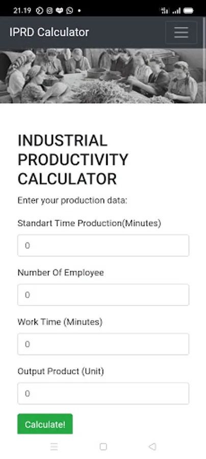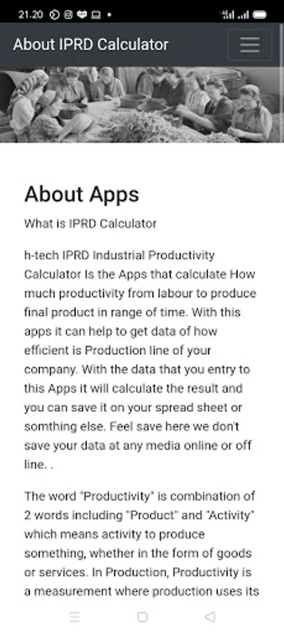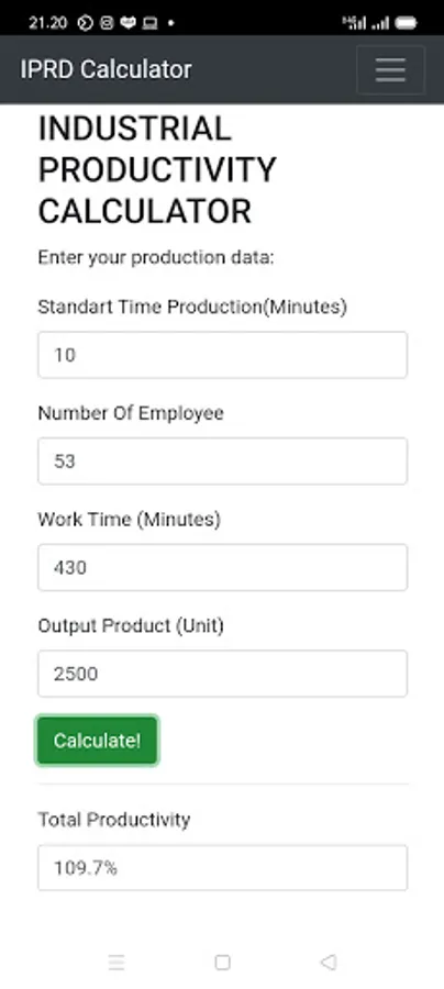 h-tech IPRD Industrial Productivity Calculator Is the Apps that calculate How much productivity from labour to produce final product in range of time. With this apps it can help to get data of how efficient is Production line of your company. With the data that you entry to this Apps it will calculate the result and you can save it on your spread sheet or somthing else. Feel save here we don't save your data at any media online or off line. .
