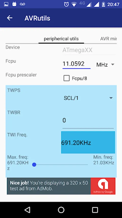 For TWI (I2C) obtain the TWBR values that provides the desired operation frecuency.