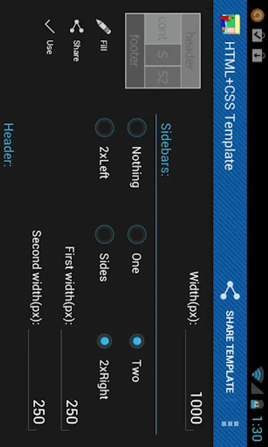 This program make a template for your site. When you fill form, you can get a completed html+css template. This template you can save at the your android device or send by internet.