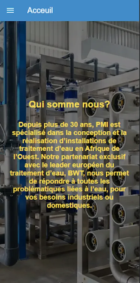PMI BY BWT is an application specializing in the design and construction of water treatment facilities in West Africa. Our exclusive partnership with the European leader in the sector, BWT, allows us to respond to all water-related issues for your industrial or domestic needs.