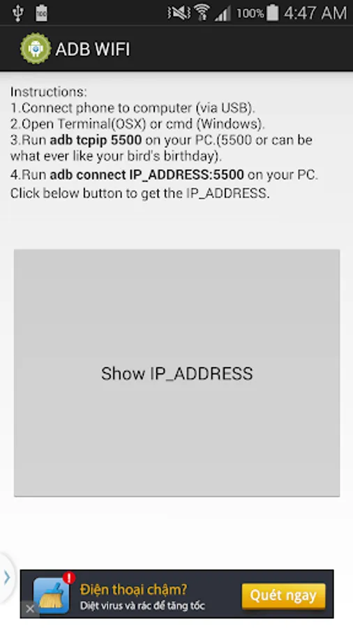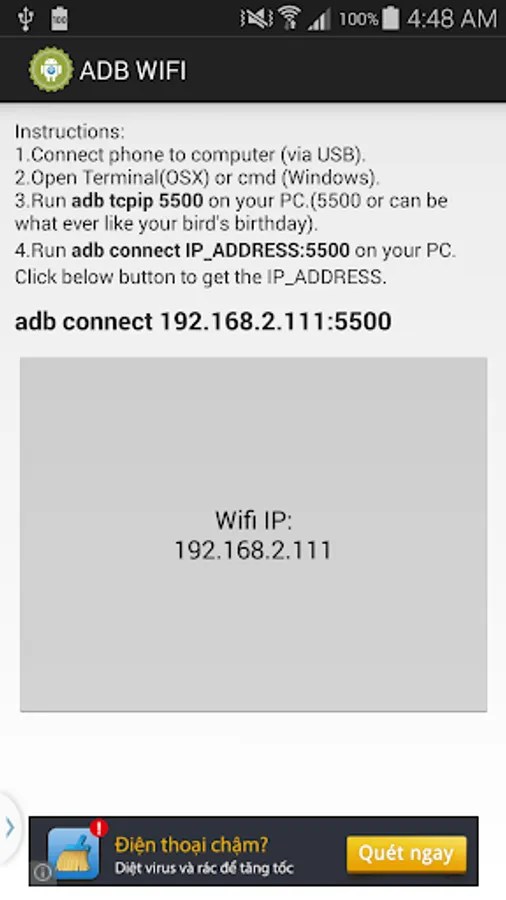 3. Run "adb tcpip 5500" on your PC. (5500 is a port, it can be what ever number you love :3)