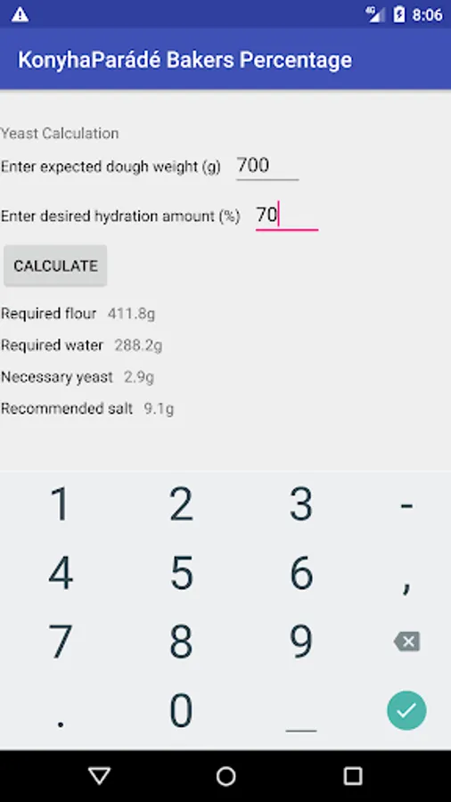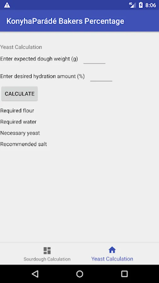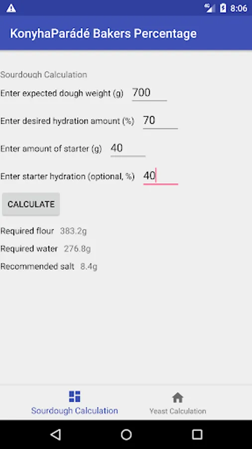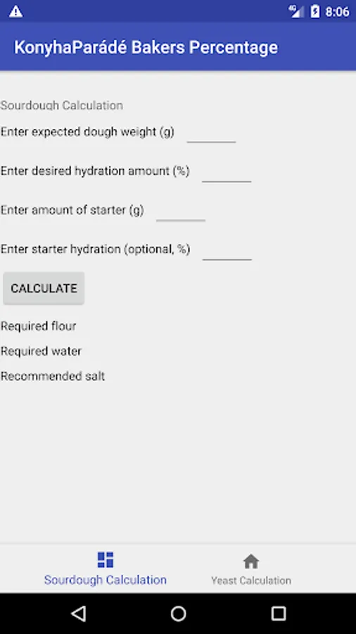 A quick way to calculate the necessary flour and water ratio for baking bread. The app includes both a calculator for sourdough and for yeast