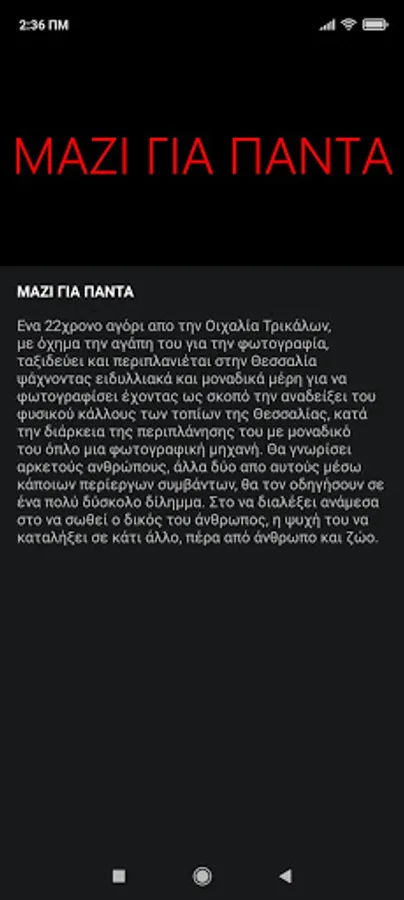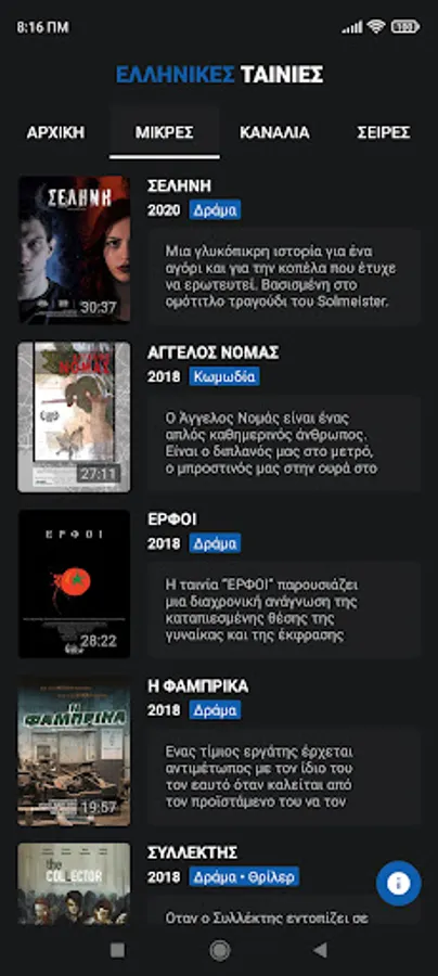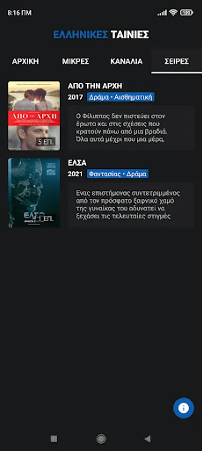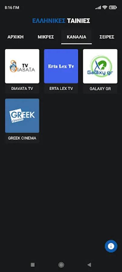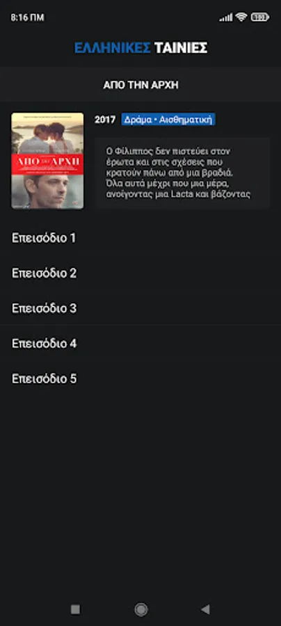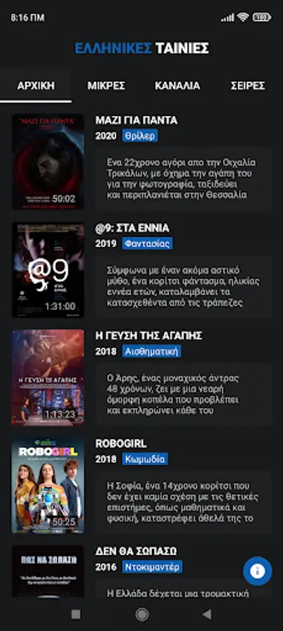 The application provides you with a list of free Greek movies, which were uploaded on the internet by their creators / owners. In addition, there are some channels with non-stop cinematic content, as well as Greek series.