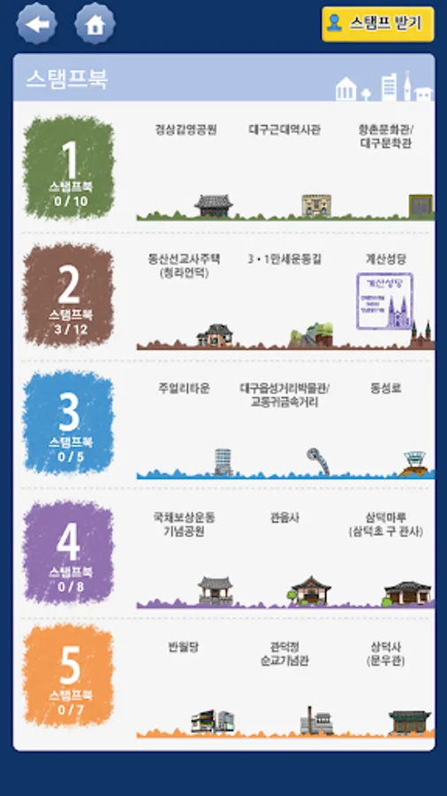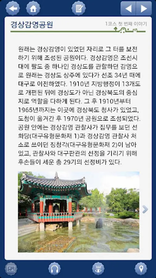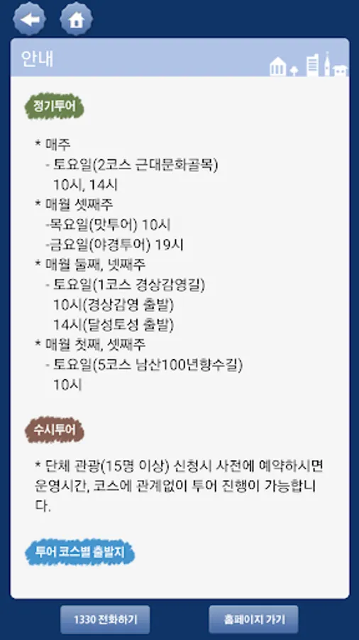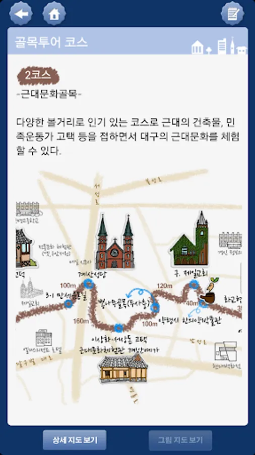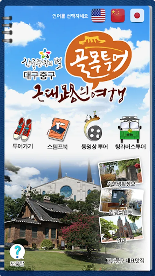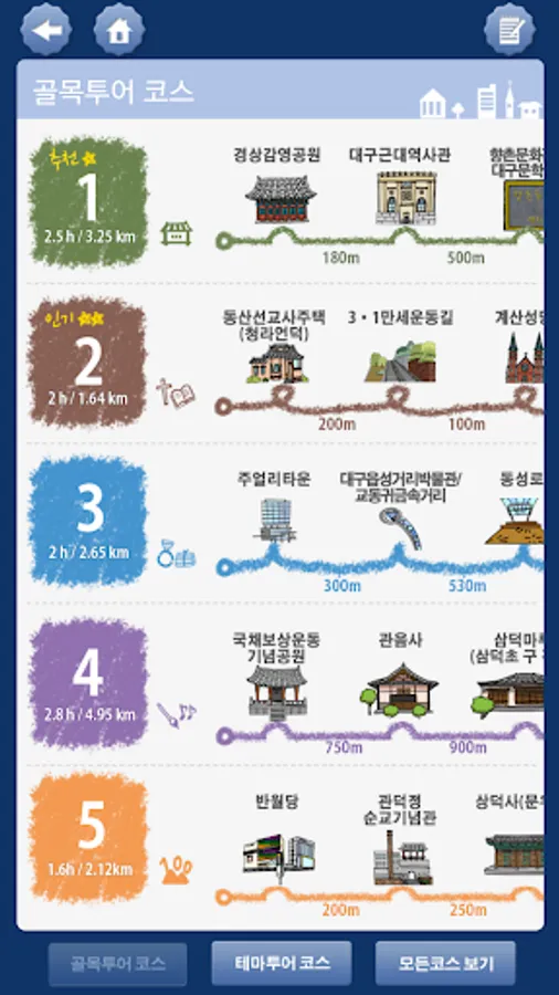 Daegu Jung-gu Modern Alley Tour 5 courses (1 course Gyeongsanggamyeong Dalseong-gil 2 courses 2 courses Modern Culture Alley, 3 courses Fashion Oriental Road, selected as' Star of Korean Tourism ', '99 Domestic Tourist Spots that Koreans Must Visit') 4 The course introduces Samdeokbongsan Culture Road, 5 courses Namsan 100-year-old Hyangsu-gil) and theme tours.