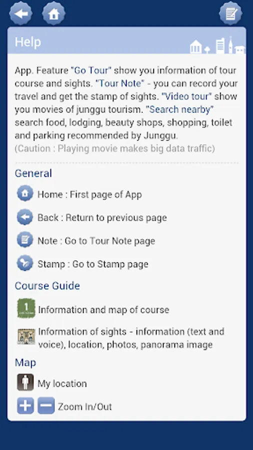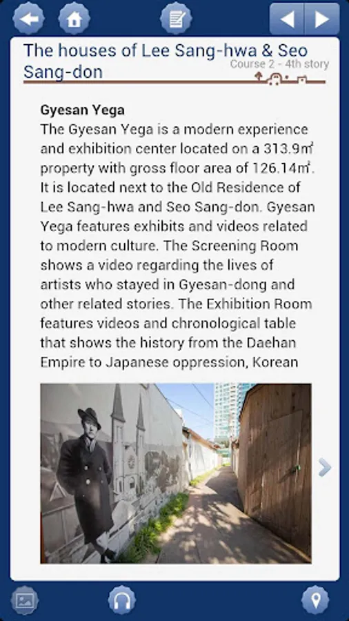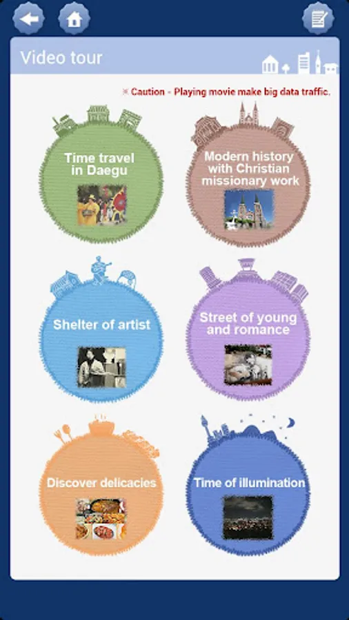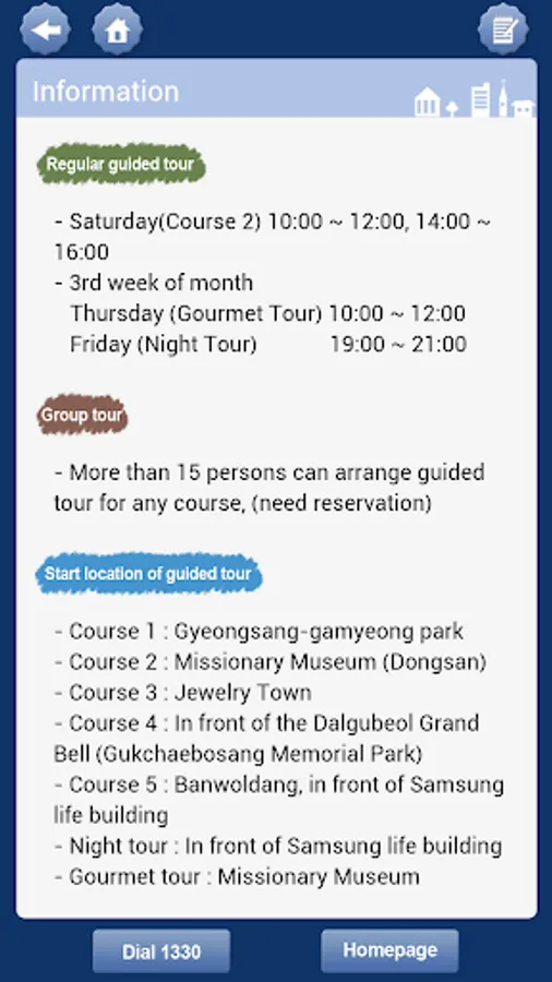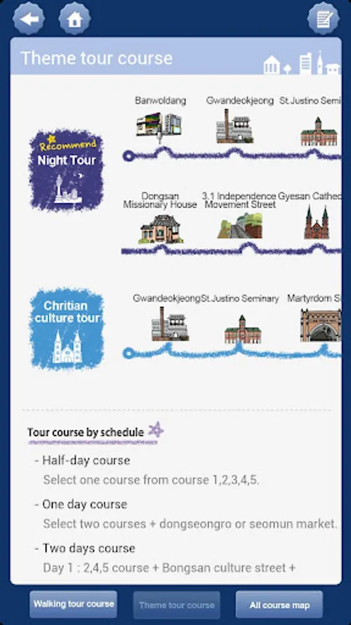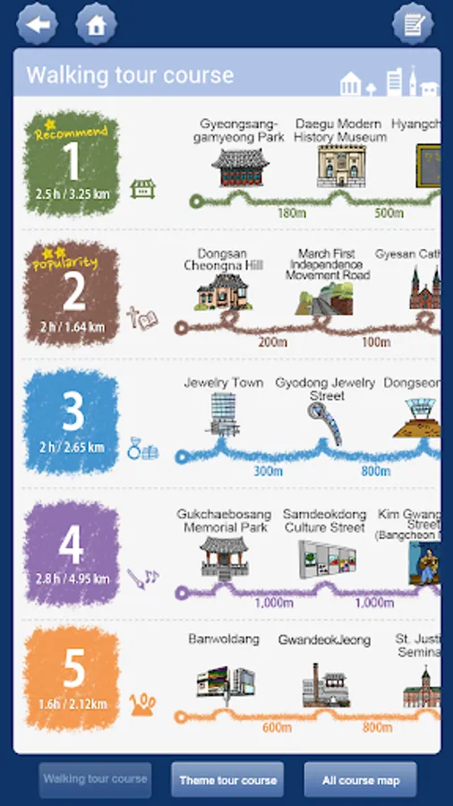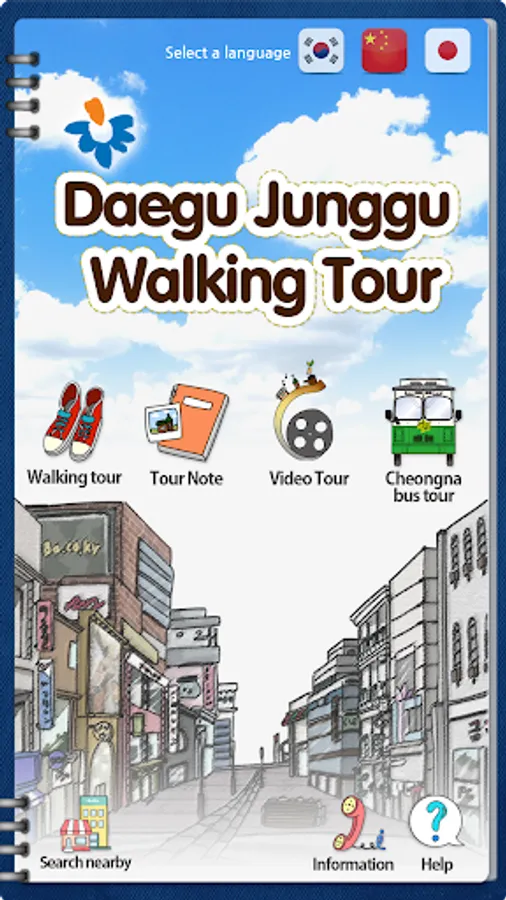 DaeguJunggu’s Walking Tour was selected as one of the “ninety-nine must-visit tourist attractions for Koreans” and “2012 Korean Tourism awards”. This application program provides detailed information about DaeguJunggu’s Walking tour courses (Course 1: Gyeongsang-ga-myeongDalseong road, Course 2: Modern Culture Alley, Course 3: Fashion and Oriental Medicine Road, Course 4: SamdeokBongsan Culture Road and Course 5: Namsan 100th year History Road) as well as the themed tour courses. It also provides a way-finding program and neighborhood search function, as well as allowing you to record your memories of the tour.