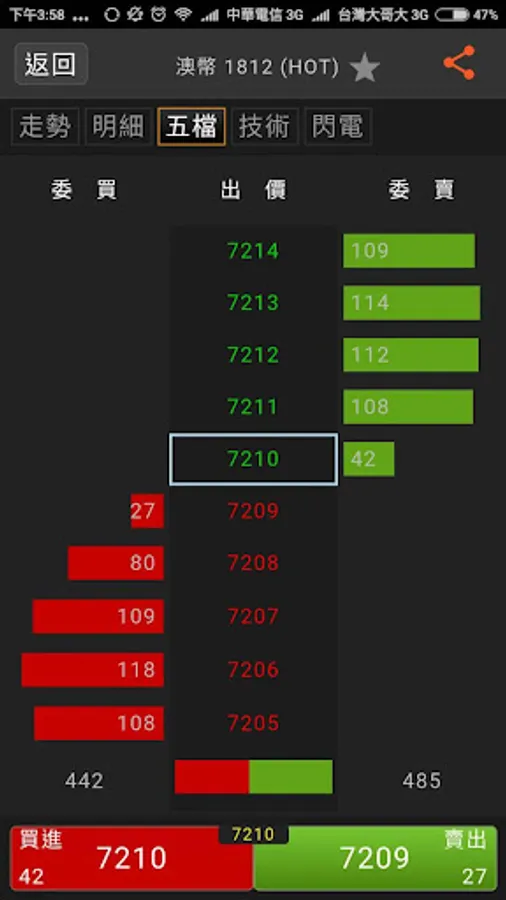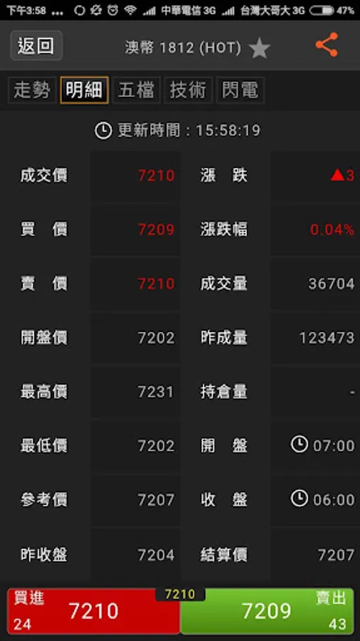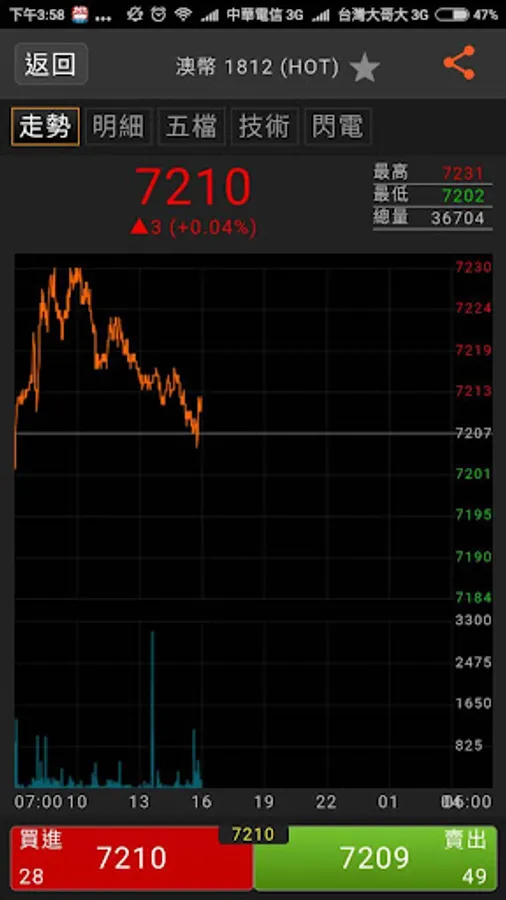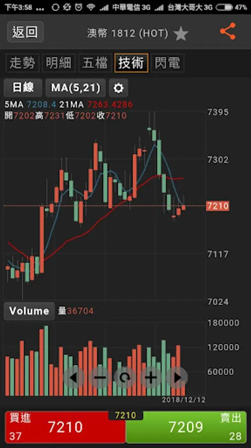 -技術線圖:支援5分鐘、60分鐘、日、周、月線圖,可觸控指標切換技術指標。