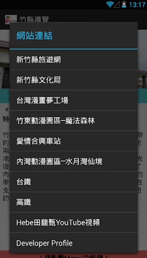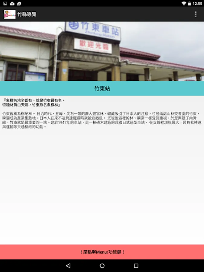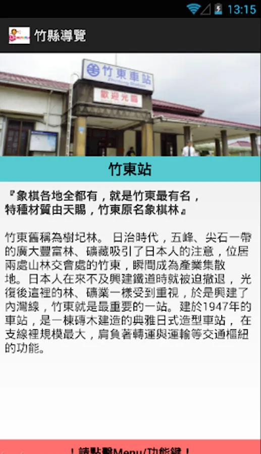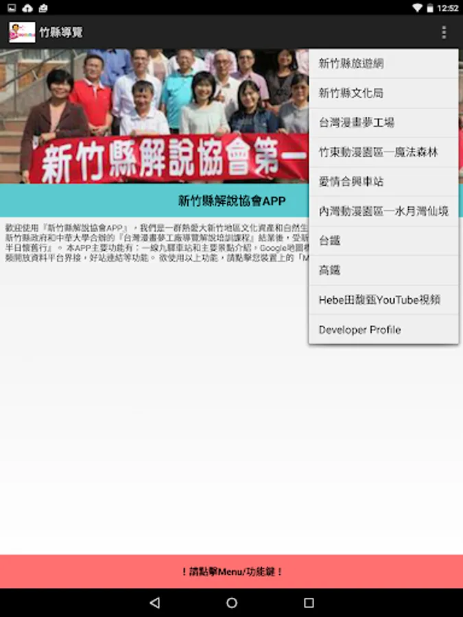 歡迎使用『新竹縣旅遊導覽APP』,我們是一群熱愛大新竹地區文化資產和自然生態的導覽志工,於民國103年由觀光局,新竹縣政府和中華大學合辦的『台灣漫畫夢工廠導覽解說培訓課程』結業後,受新竹縣政府委託,負責導覽『竹東-內灣半日懷舊行』。