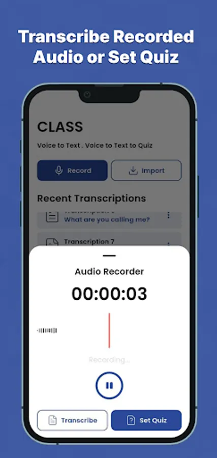 CLASS enables users to record or import audio directly from their device and convert it into text through transcription. The transcribed text can then be read, shared, or used to create quizzes.