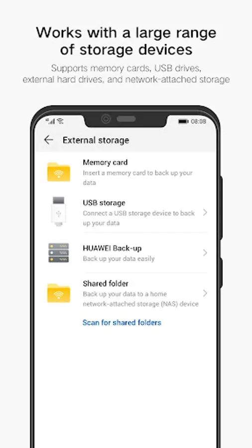 • Save your backups to memory cards, USB drives, or the cloud. Some device models support backing up to network-attached storage or Huawei Back-up.