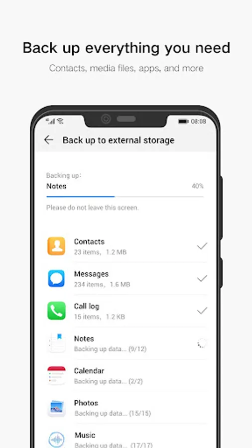 Never lose your data again. Backup allows users of Huawei devices to easily save an extra copy of their data,including contacts, SMS and MMS, call records, apps, media files, and more to a storage device or to the cloud.