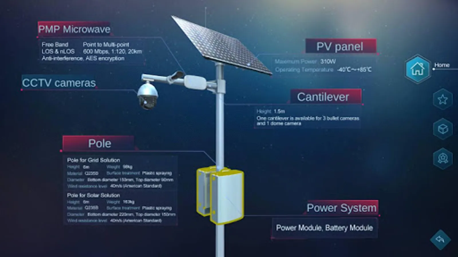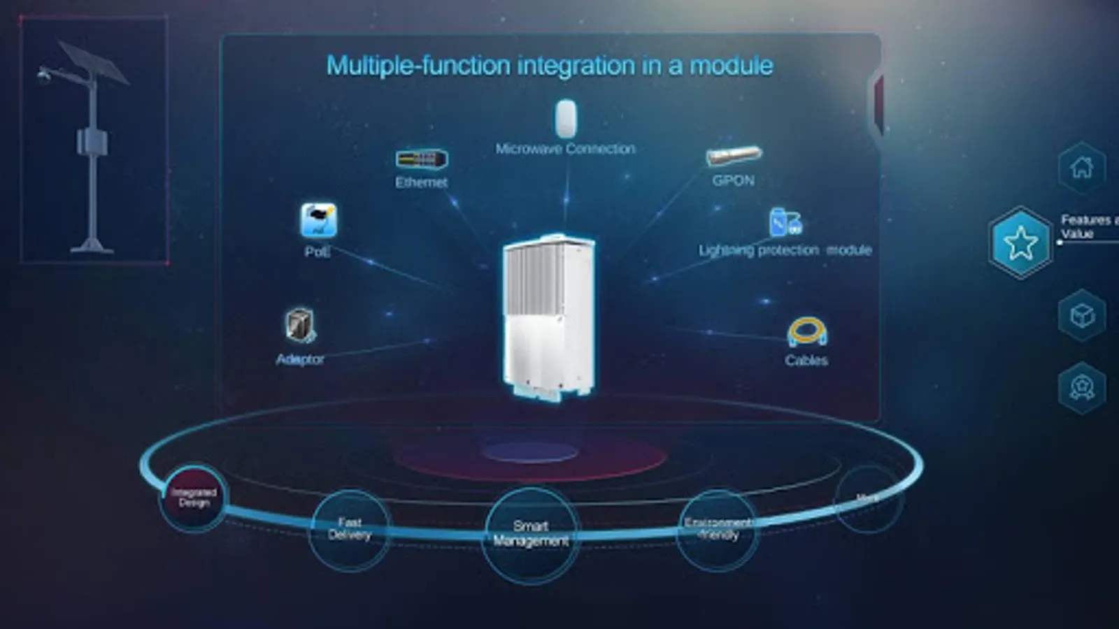 The PowerCube 500 Integrated Video Site uses Augmented Reality technology to present the realistic rendering of the detailed system structures, highlights, application scenarios and customer values, suits for on-site multiplayer interactive experience in exhibitions.
