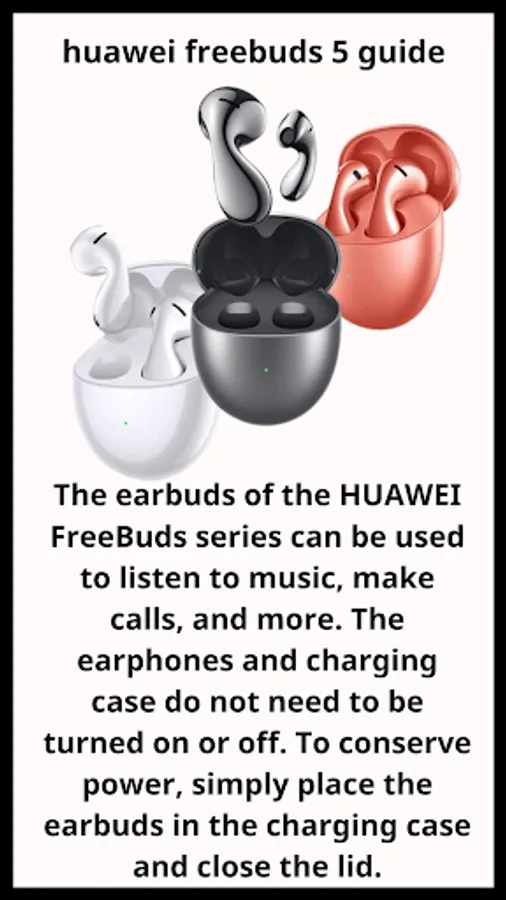 Huawei freebuds 5 guide app is not an official app. It is just a tutorial app that helps friends to better understand the instructions of huawei freebuds 5. In-app information collected from websites. The information that we provide is from various reliable sources. All images, information and names within the app are owned by their respective owners. We do not claim any rights.