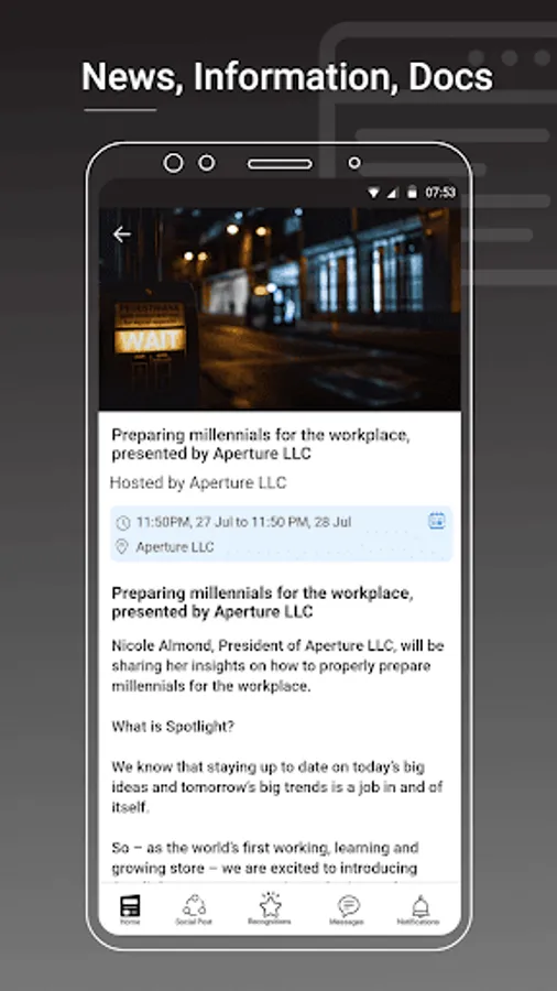 Amplify by Aperture is a free mobile communication and messaging app available for use by registered & active designated Aperture LLC users. Amplify by Aperture helps the company, elevate two-way communications and push relevant and timely information to users.