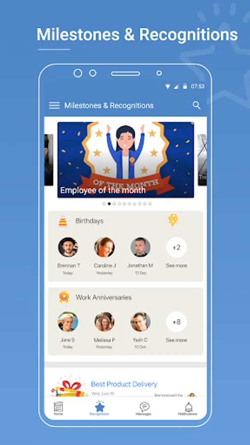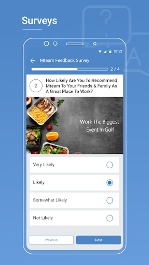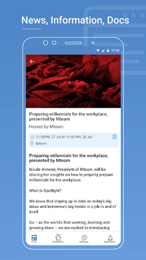 M Team is an employee app for employees of MCulinary. Employees must use their employee ID number to access the app. M Team is a news and information hub for employees and a way to interact with and provide input to the company. The app features a newsfeed with news from the company, a module to submit employee stories, polls and surveys, a chat module, and a way to earn points that can be redeemed for company merchandise.