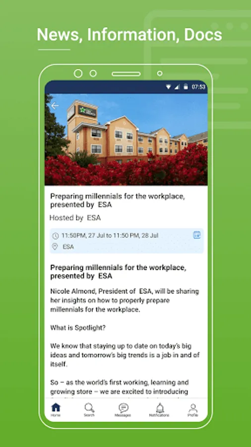 MyESA App is a free mobile communication and messaging app available for active, designated Extended Stay America associates who choose to register and use it. MyESA App helps the Company to facilitate and encourage two-way communications and deliver content to users.