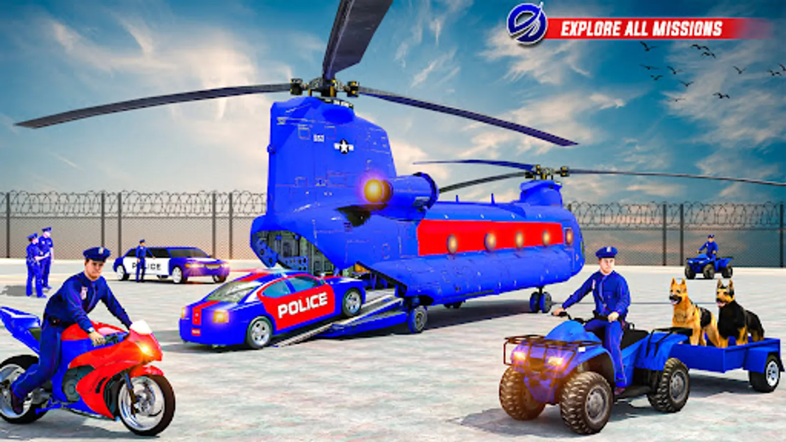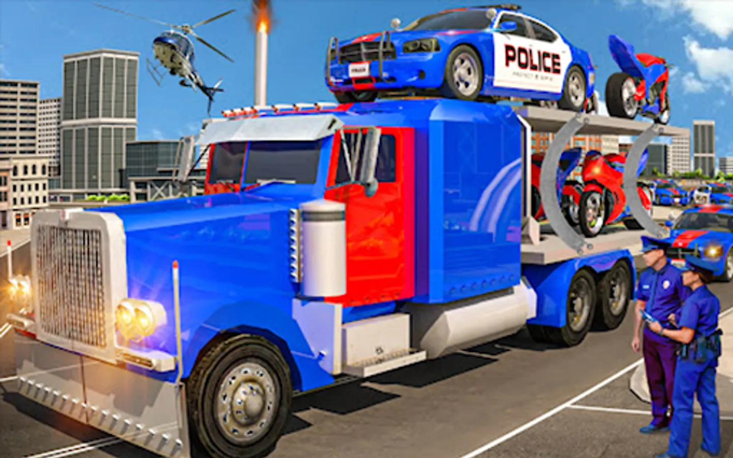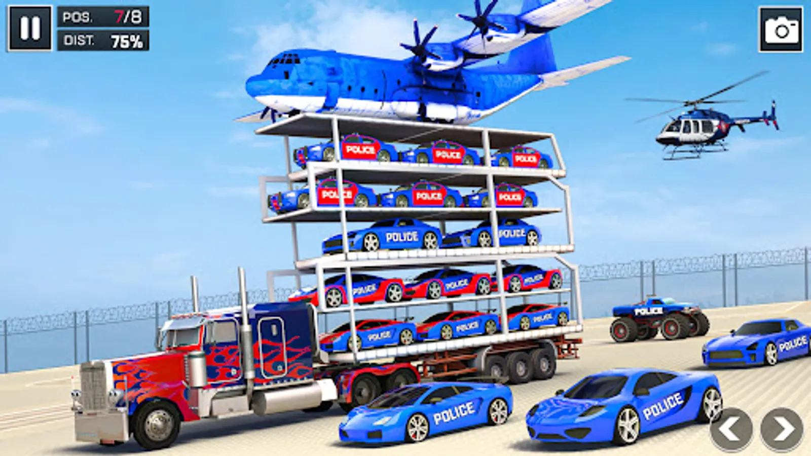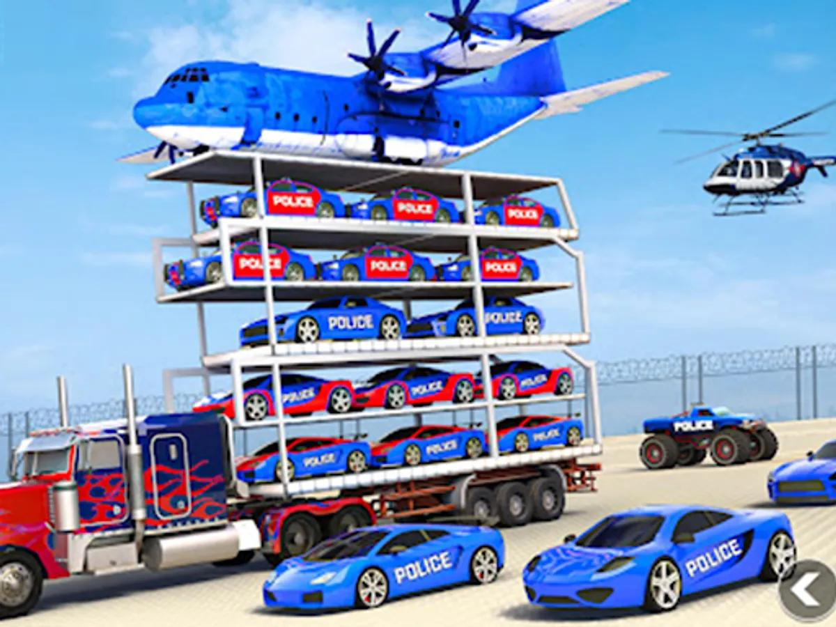 Police car Transport truck trailer has multiple levels in truck simulator 2022. Drive a blue police truck to the US police transport truck and park them like multi-story car parking in an American truck simulator 2022. Drive the loaded police transport truck to the helipad in the best transport truck games 2022. Load the Police limo to the plane in national police plane transport mode. Fly police Cargo Plane to the other city among Limo car transporter truck game. Unload the police transport truck from the police cargo plane. A multi-level car parking simulator is a transport truck game challenge with the ability to drop a blue police truck to destinations across the city to become a crazy trucker in US police parking games with music.
