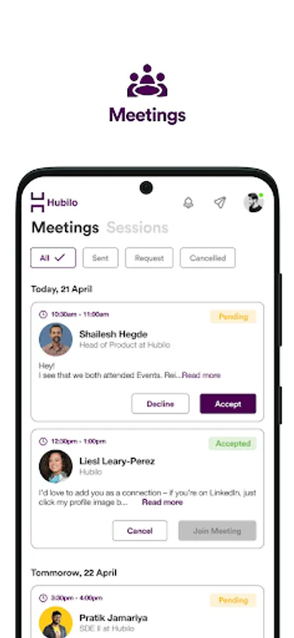 Set up meetings with potential attendees (investors, mentors, industry CxOs) by using the chat feature.