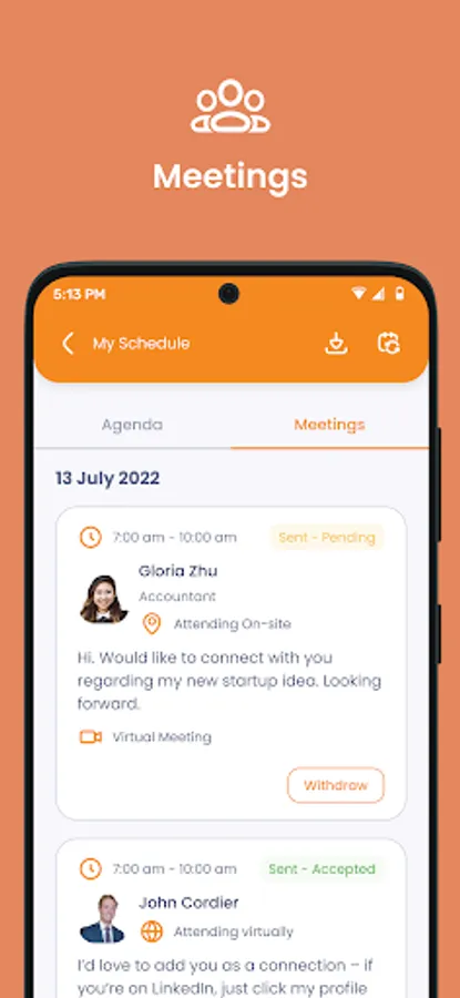 Set up meetings with potential attendees (investors, mentors, industry CxOs) by using the chat feature.