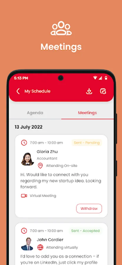 Set up meetings with potential attendees (investors, mentors, industry CxOs) by using the chat feature.