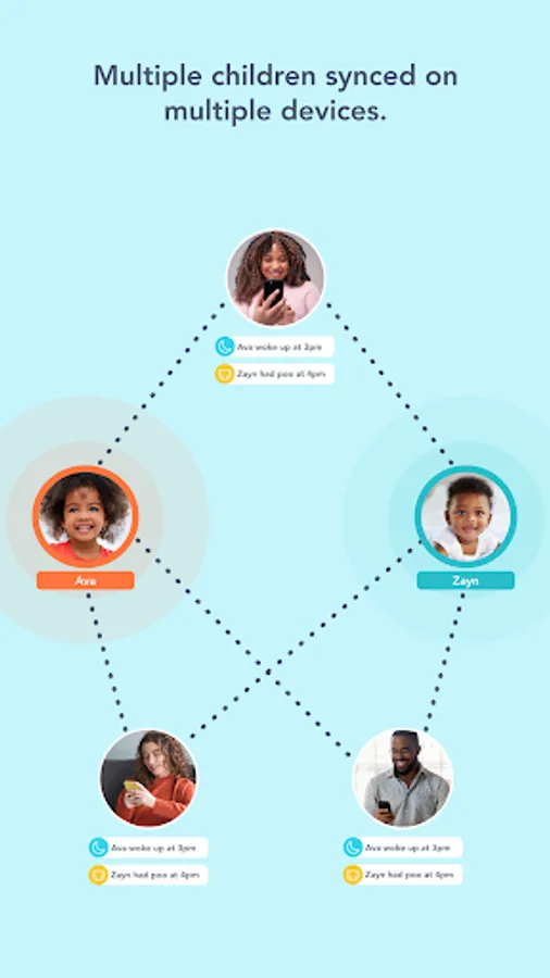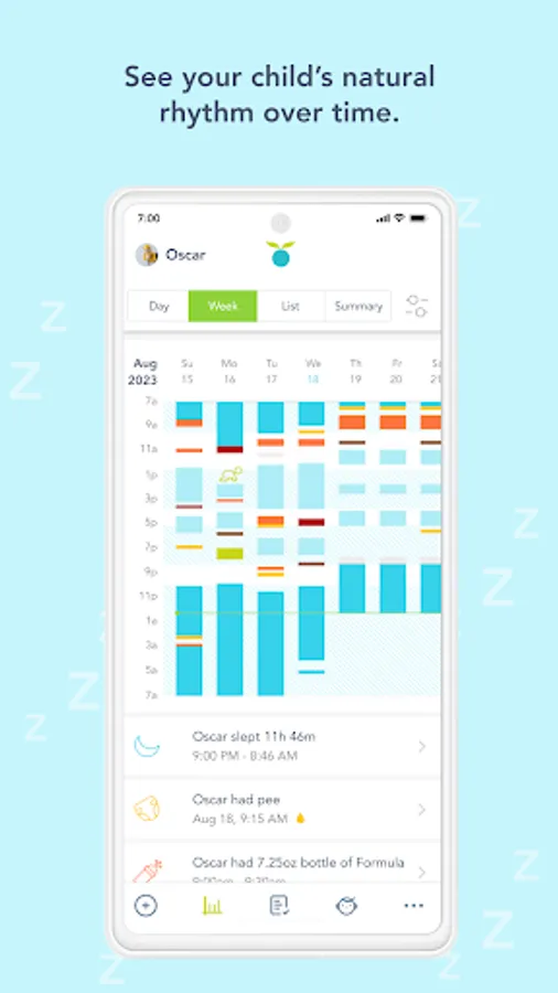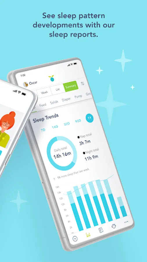 - Daily charts and stats to monitor your little one’s eating and sleep patterns and trends