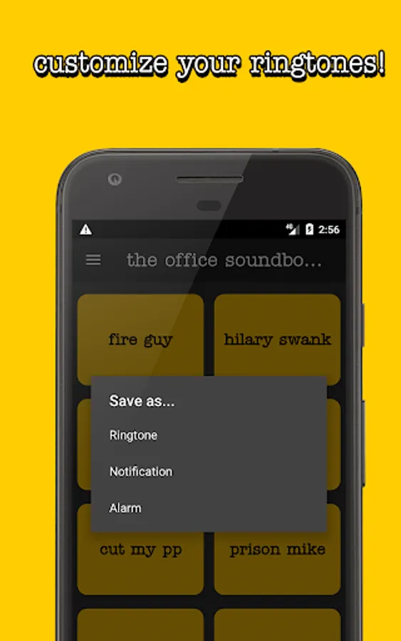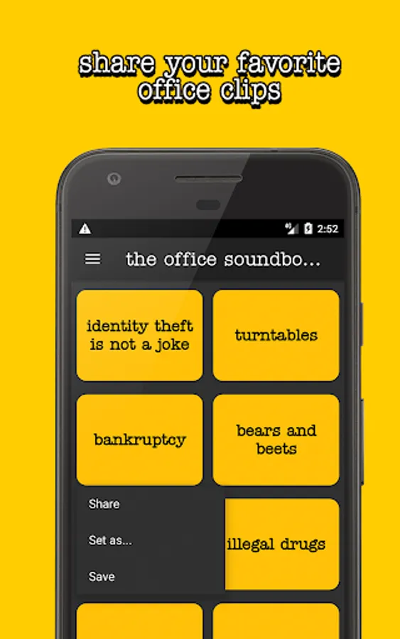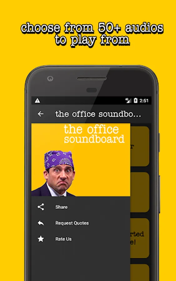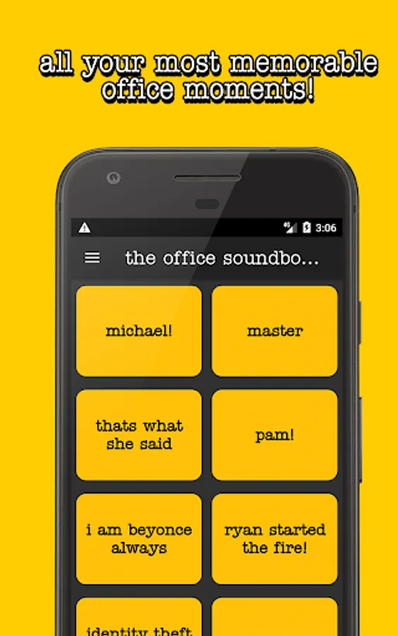 The office soundboard stars many cool characters including characters such as Michael Scott, Dwight Schrute and Pam Beesly. A fun little app to be used and played with among friends and family. You can share sounds through various applications to your friends and mess around with them. The app is constantly being updated with funny audio clips from The Office Seasons 1 to 9 every week. You also have the ability to save your funniest clips or audios as alarms, ringtones and even notifications.