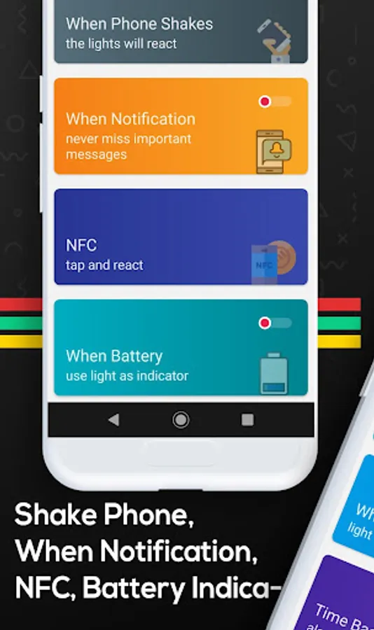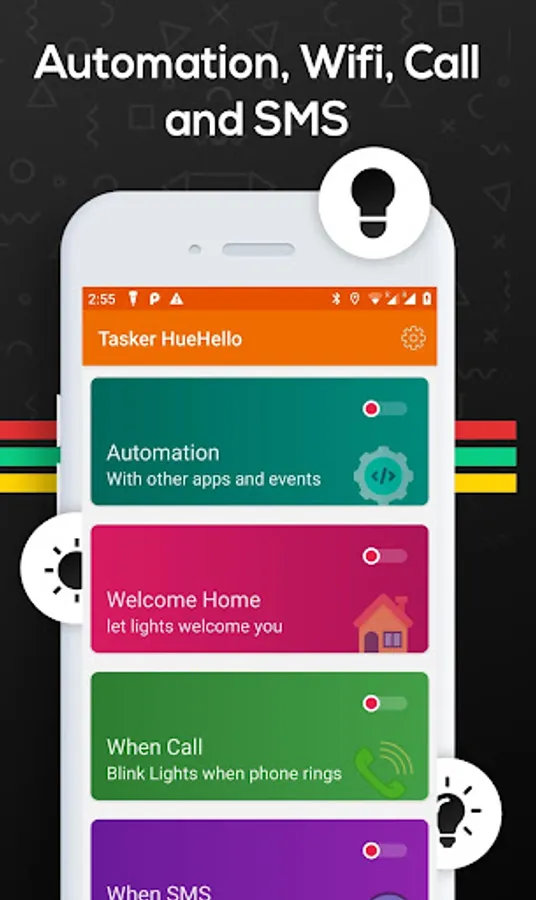 Not only that, There are unlimited possibilities with our automation feature. You can configure lights with any events using the broadcast mechanism of Android. Many apps like Tasker, Automation support broadcast.