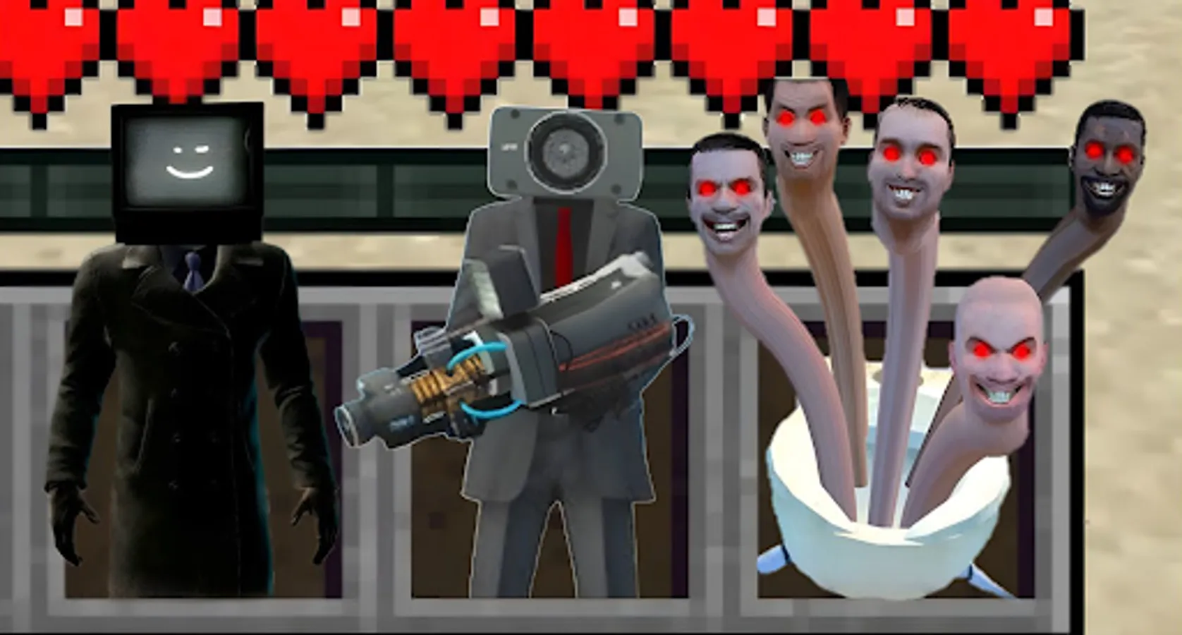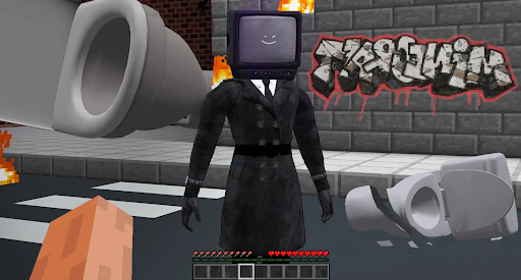 Skibidi Mod for Minecraft adds TVman, CameraMan, Titan Speakerman Fight MCPE world. You can use skin of characters or other NPC to fight, craft and explore world of cubes and pixels.