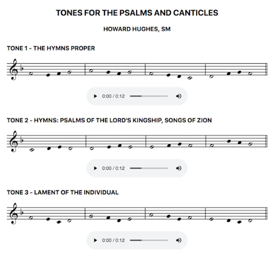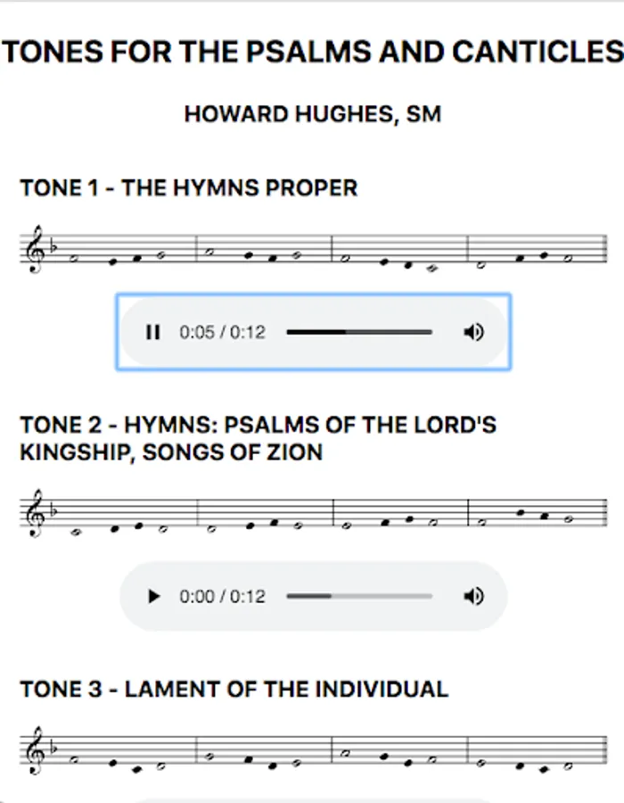 This app plays the "Tones for the Psalms and Canticles" written by Howard Hughes, SM. All twelve tones are presented along with a recording. Religious communities and other groups can use this app while at prayer (in lieu of an accompanist) to intone the antiphons and psalms.